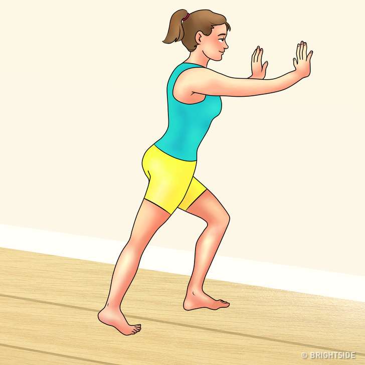 ▼雙手推牆,左腳向前邁步,右腳尖蹬地,保持30秒。左右腿交叉練習,每條腿重複3次,幫助你拉伸腿部的肌肉。