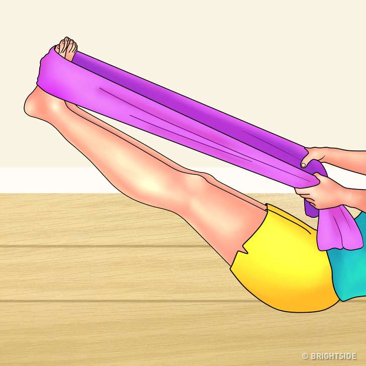 ▼坐在地板上,背部挺直,雙腿併攏伸直。雙腳踩住彈力帶,雙手緊握,慢慢抬起雙腿保持30秒。整個動作重複5次,更好的鍛鍊腿部後側的韌帶和肌肉。