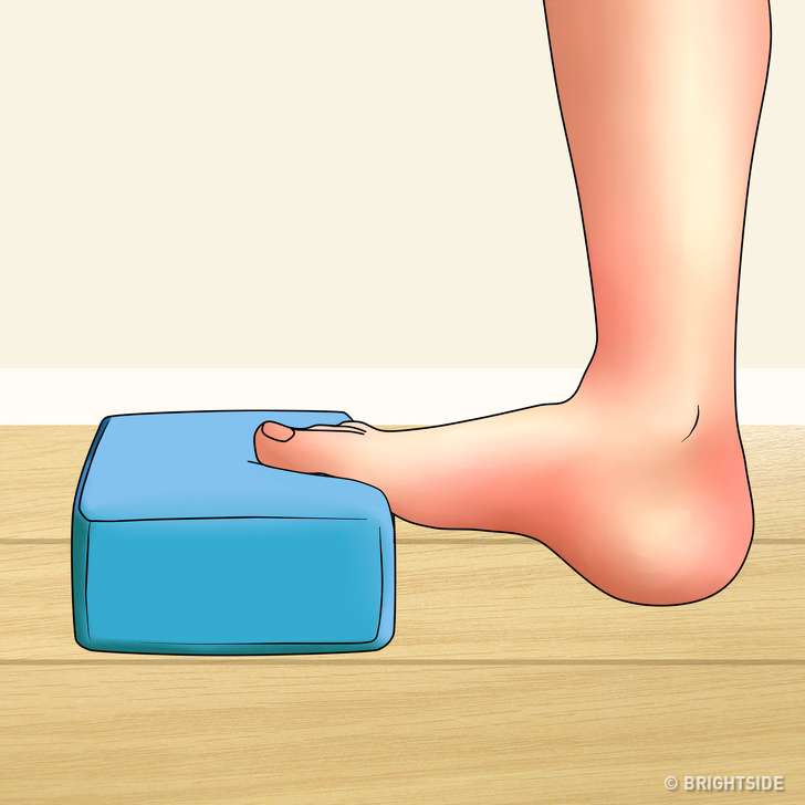 ▼一隻腳的腳趾踩在瑜伽磚上,腳後跟著地。每隻腳保持30秒,將整隻腳充分的拉伸,左右腳個5次。