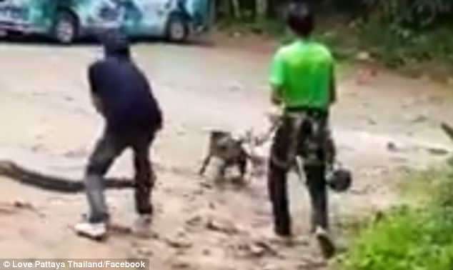 ▼愛心人士在嘗試撬開巨蟒失敗後進行了更大膽的嘗試,其中一人用力拽住巨蟒的尾巴,不斷將巨蟒拖離狗狗。