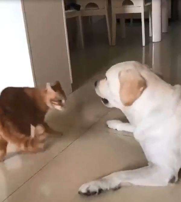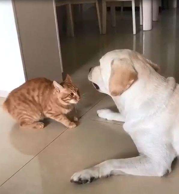 ▼貓咪被嚇到,倒退幾步,牠沒有放棄,很快回到狗狗面前,睜大無辜的眼睛看著牠。