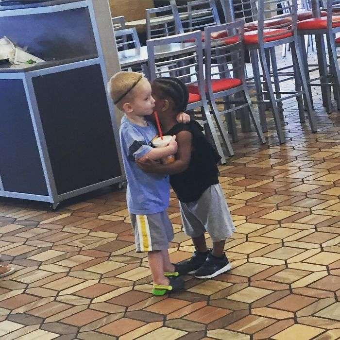 ▼不相識的兩個孩子在速食店玩了起來,還擁抱在一起。