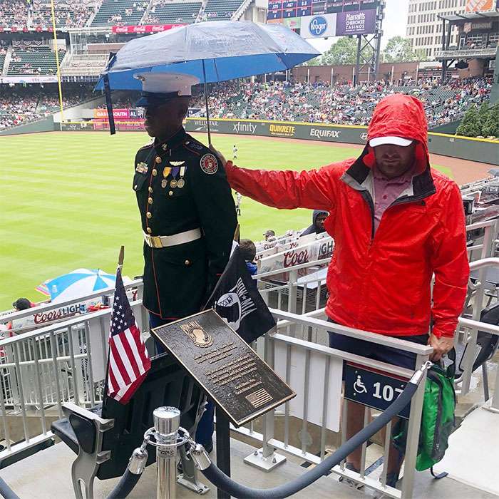 ▼下雨天,一位球迷為正在執勤的小士兵撐傘。