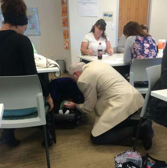 ▼一位初為人母的媽媽不得不帶著嬰兒來上課,正在考試中,嬰兒突然大哭,可愛的教授就跪在地上給寶寶餵奶,還一邊晃動著搖籃安撫他。