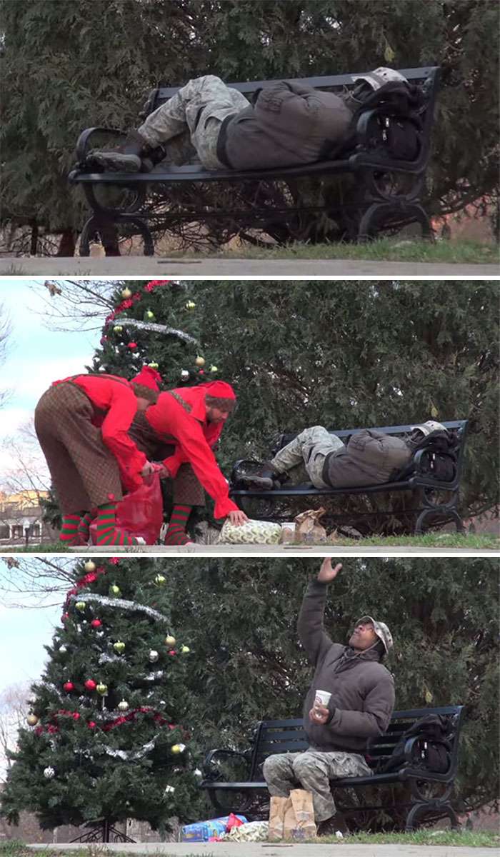 ▼聖誕精靈們悄悄的給流浪漢留下食物,給他一個大大的驚喜。