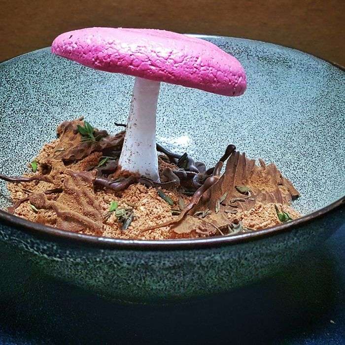 ▼紅色的蘑菇是櫻桃口味的蛋糕,香葉和桂皮是巧克力做成的。