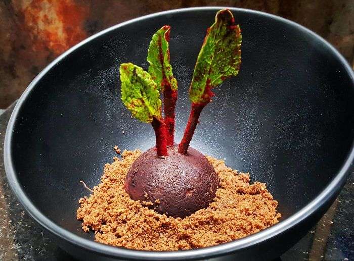 ▼巧克力和布朗尼製作出「發芽的甜菜」。