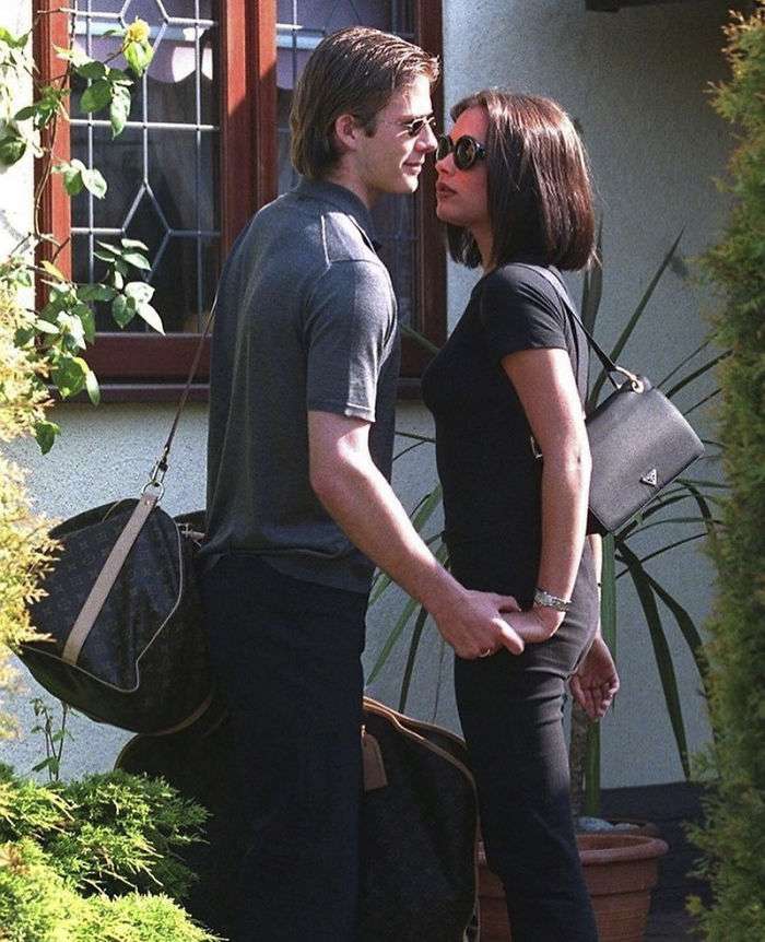 ▼1997年,大衛貝克漢(David Beckham)與維多莉亞貝克漢(Victoria Beckham)在父母家門外。
