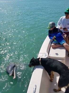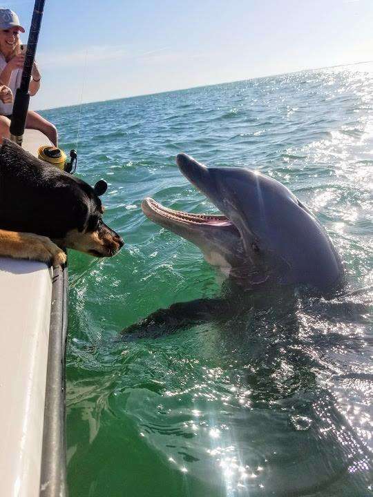 ▼不過即使露西從不下水,可是牠卻意外的和海洋中的海豚成為了好朋友!原來某次露西跟著主人吉爾克里斯(Gilchrist)一起搭船出航,經過佛羅里達州的卡普蒂瓦島附近海域時,一隻當地很有名的海豚「古斯」發現了露西,不斷和牠玩耍。