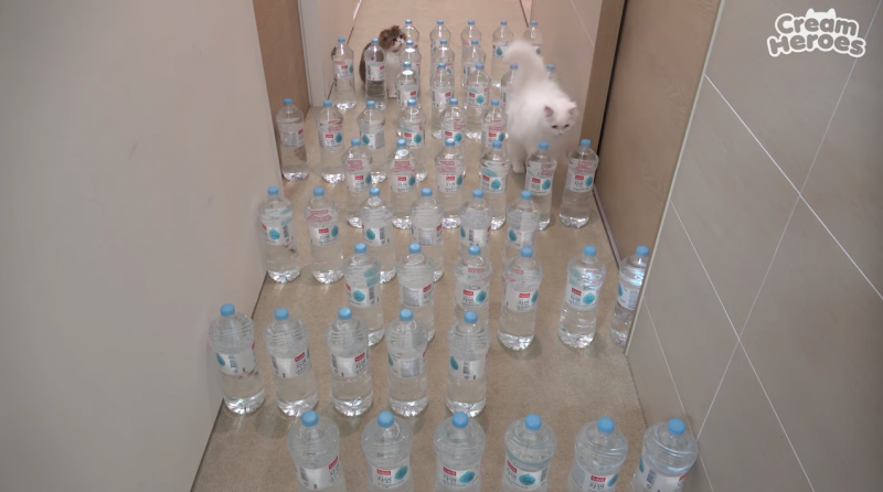 ▼鏟屎官一瓶瓶的把水轉移到通道內,而「主子們」完全不知道她在搞什麼鬼。於是她設計了一個「4層迷宮」想要考驗一下喵星人,但主子們完全不理解其中的樂趣,有的選擇了最直接的「跨欄」,有的從瓶子的縫隙中鑽了過去。