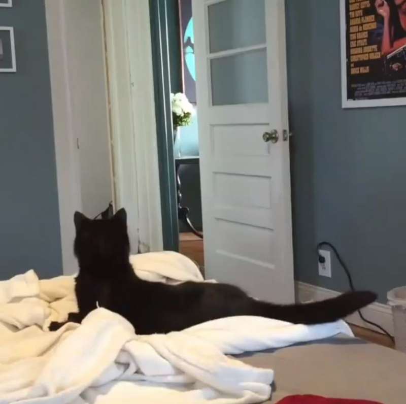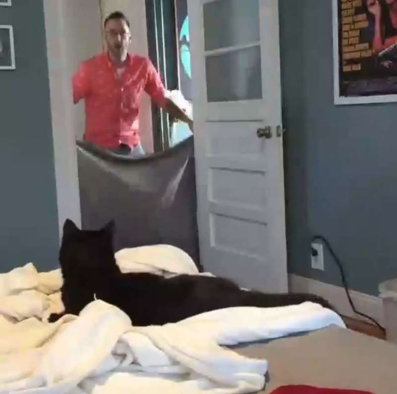 ▼下面這名男網友就站在門口,手拿大毛巾準備變魔術。他家的貓星人躺在床上,懶洋洋看著牠,好像在問:「鏟屎的,你要幹嘛?」