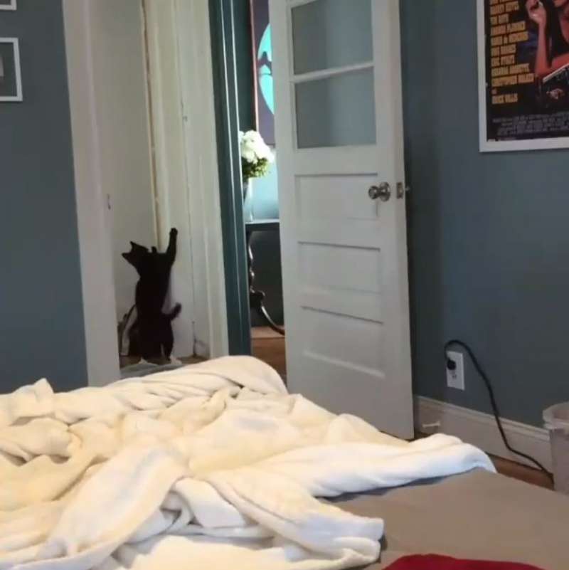 ▼毛巾落下來時,男網友躲了起來。貓星人看到這一幕嚇壞了,連忙跳下床尋找,還不停喵喵叫,呼喚自家鏟屎官。