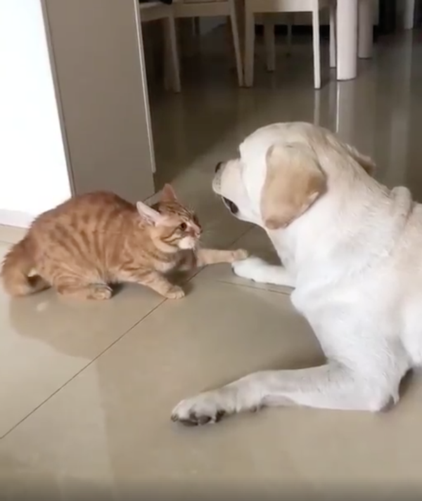 ▼這隻貓咪原本似乎想跟這隻大狗玩,就咬了人家的腳一口。這個舉動讓狗狗不太開心,就大聲吠了一下,貓咪也嚇到彈開。
