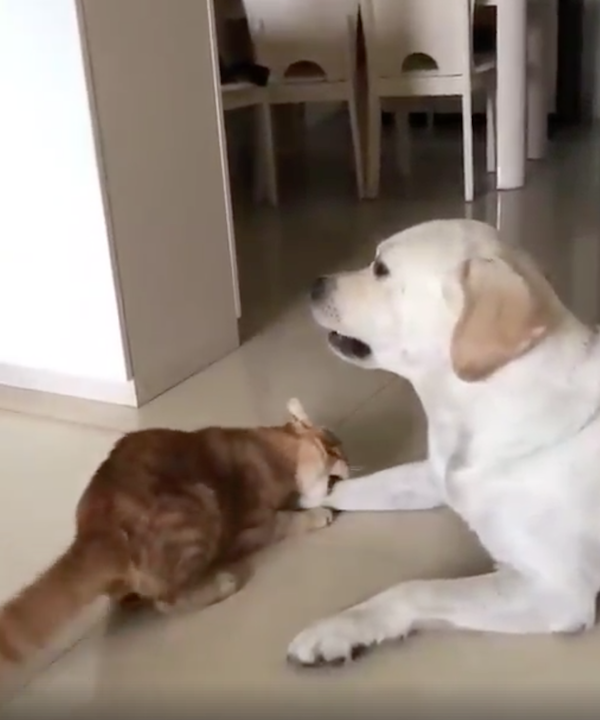 ▼但察覺到好朋友生氣後,貓咪就小心伸出爪爪,覆蓋在狗狗的腳上,好像在說:「我們和好嘛~」
