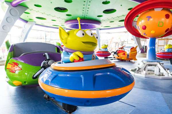 ▼另外還有老少咸宜的三眼怪旋轉咖啡杯,建築物是重現了安迪在披薩星球獲得的玩具,底下是由三眼怪駕駛的飛船,幸運的話,你還有可能會夾子夾起來!