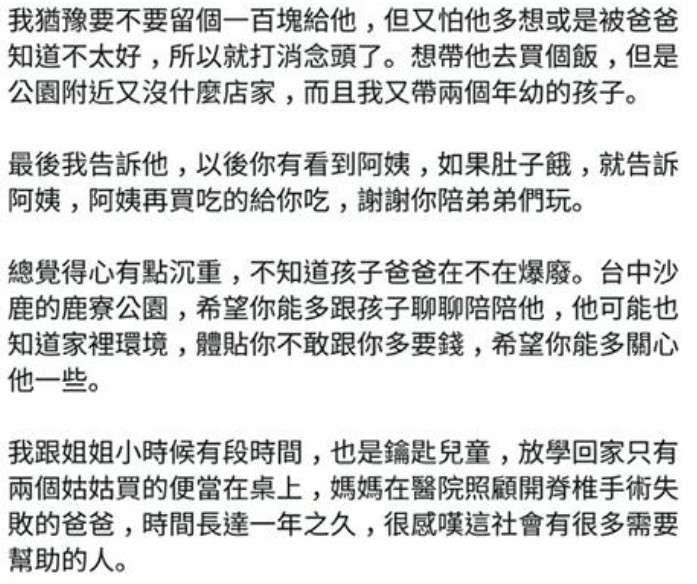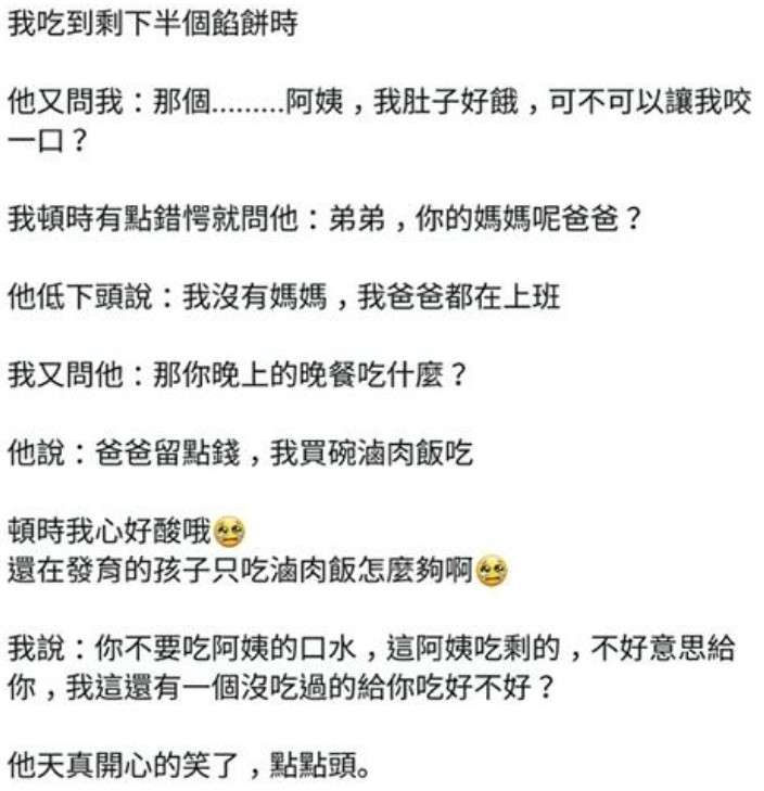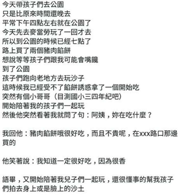 ▼根據原po表示,這名男童不僅陪著她的孩子玩,還很懂事的幫她孩子們拍去身上或是臉上的沙土。不過當原po吃豬肉餡餅到剩下一半時,這名男童突然問她「那個…阿姨,我肚子好餓,可不可以讓我咬一口?」讓原po錯愕的詢問:「弟弟,你的媽媽爸爸呢?」男童表示他沒有媽媽,而爸爸在上班。當原po詢問他晚餐吃什麼時,男童表示「爸爸留點錢,我買碗滷肉飯吃」讓原po心酸不已。