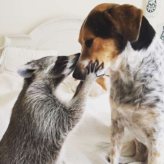 ▼南瓜沒見過其他浣熊,又與狗狗們相處久了,現在牠以為自己是一隻品種特別的狗狗。