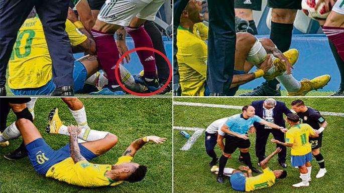 ▼比賽進行到第70分鐘時,內馬爾在邊線外被放倒在地。為了防止對方快發界外球,他將球摟到了自己懷裡。墨西哥後衛拉雲(Miguel Layún)去搶他手中的球,期間輕輕踩到了他的腳踝,沒想到他馬上大聲哀嚎,痛苦地捂著腳躺在地上打滾。