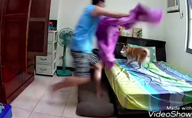 ▼只見主人陳池從衣櫃中衝出來,手中還拿著棉被,一下子蓋到了旺財身上,用特別的方式跟牠道早安。旺財被嚇了一跳,差點尿出來。