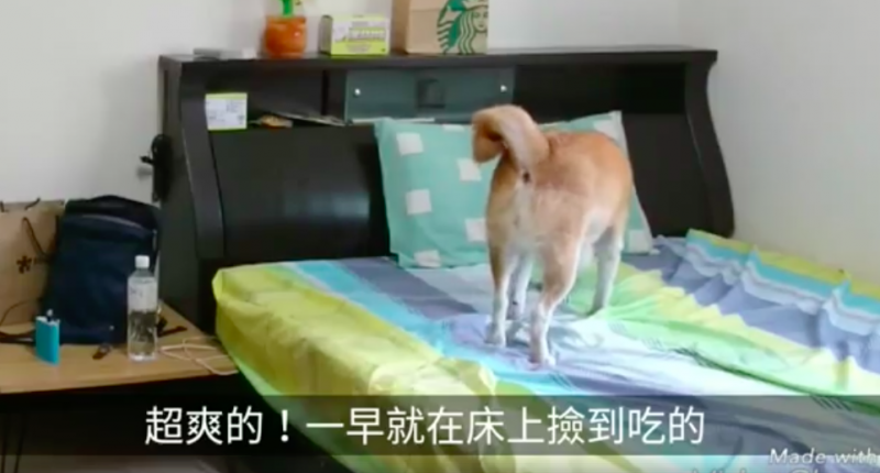▼不久前,陳池在臉書粉專「求求陳池放過旺財」po出一段影片,影片中,旺財被食物引誘到床上,還以為主人不在,可以放鬆一下,沒想到下一秒就出現「大驚喜」。