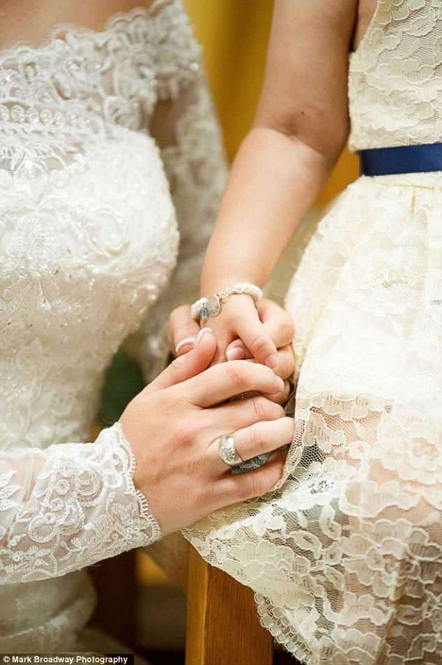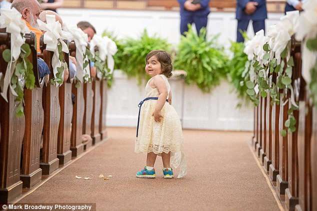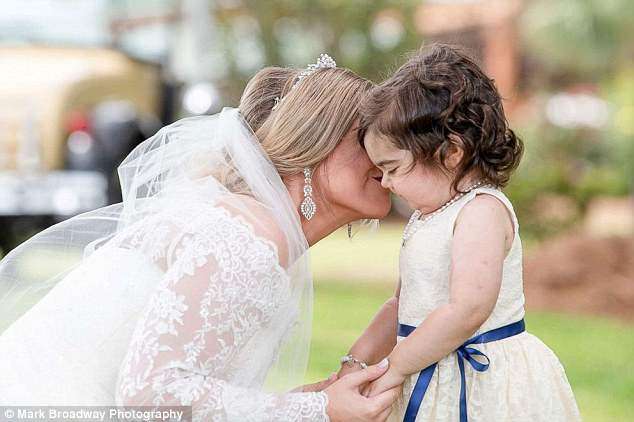 ▼Hayden見到Skye時非常高興。婚禮上,3歲的Skye穿著白色洋裝、可愛的蓬蓬裙,腰間還有一條藍色緞帶,像個小天使一樣。伴娘和來賓們看到這一幕,都感動地流淚了。