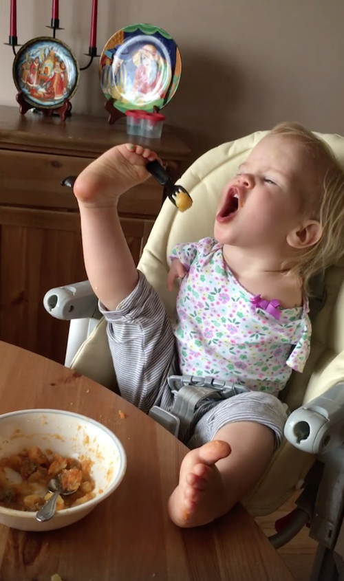 ▼在小小年紀,瓦西莉亞就會嘗試著用腳自己吃飯,她必須不斷變換角度,才能把這口飯塞到嘴裡。普通的一口飯,她得花18秒完成。
