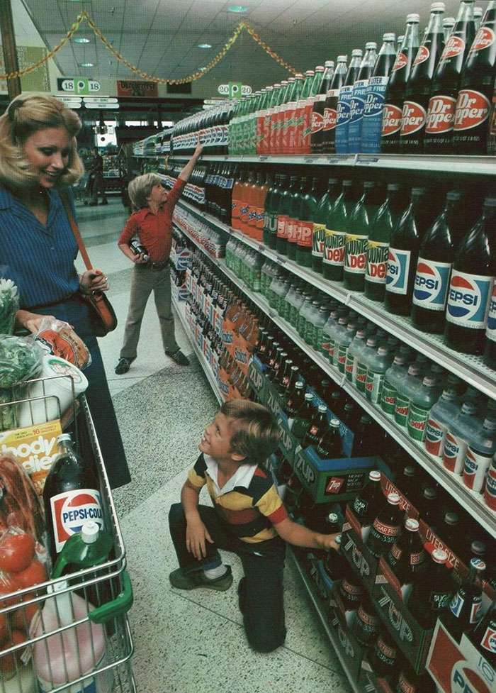 ▼1980年的雜貨店,貨架上的飲料全是玻璃瓶包裝的。