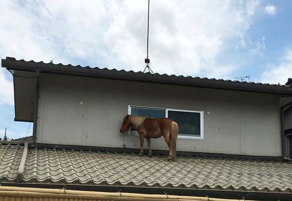 2018年07月14日西日本連日出現破紀錄暴雨,岡山、廣島、愛媛等縣都成了重災區,死亡人數高達195人,尚有65人下落不明,有6700人被迫撤離家園,不只民眾,就連動物也接連受害,奇蹟的是,有一隻叫「Leaf」的馬在洪水中失蹤3天後,出現在附近的民宅屋頂上。