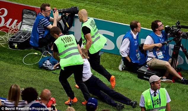 ▼下半成第52分鐘,法國2:1領先時,4名裝扮成警察的球迷衝進場內。