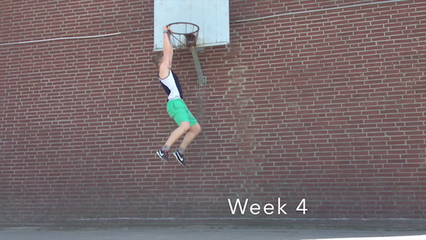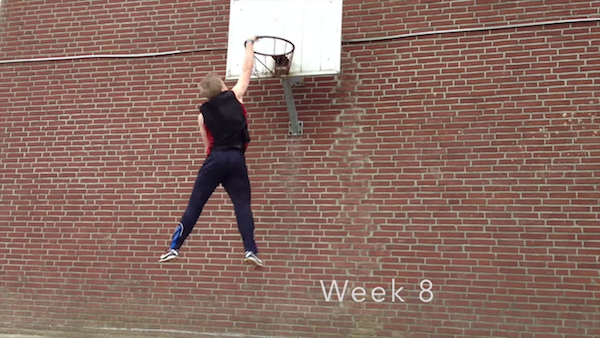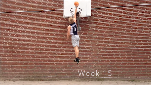 ▼剛開始他根本無法碰到籃框。經過4週的訓練,碰觸籃框已經不是問題了。