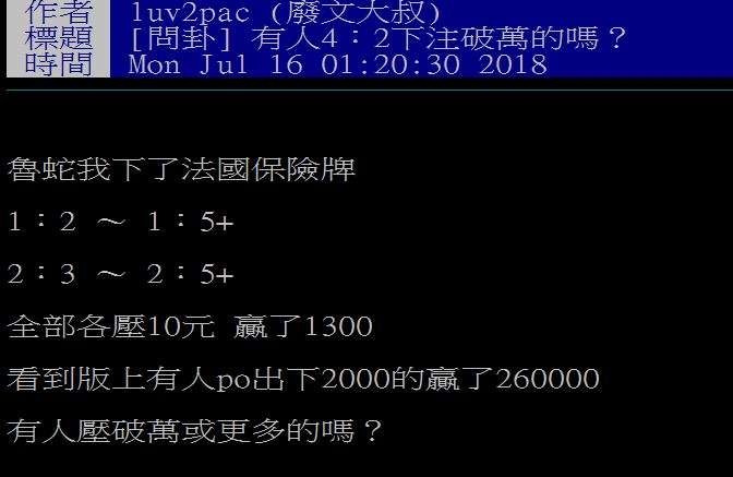 2018年07月17日時長1個月的世界盃足球賽終於在日前順利落幕,許多「一日球迷」也紛紛趁著這個4年一度的盛大賽事購買了不少運動彩券。不過當有網友在《PTT》詢問有沒有下注破萬又中獎的網友時,有人分享了一張押了2萬元法國4:2的彩券,賠率高達130倍,最後一共可以獲得的獎金高達260萬!