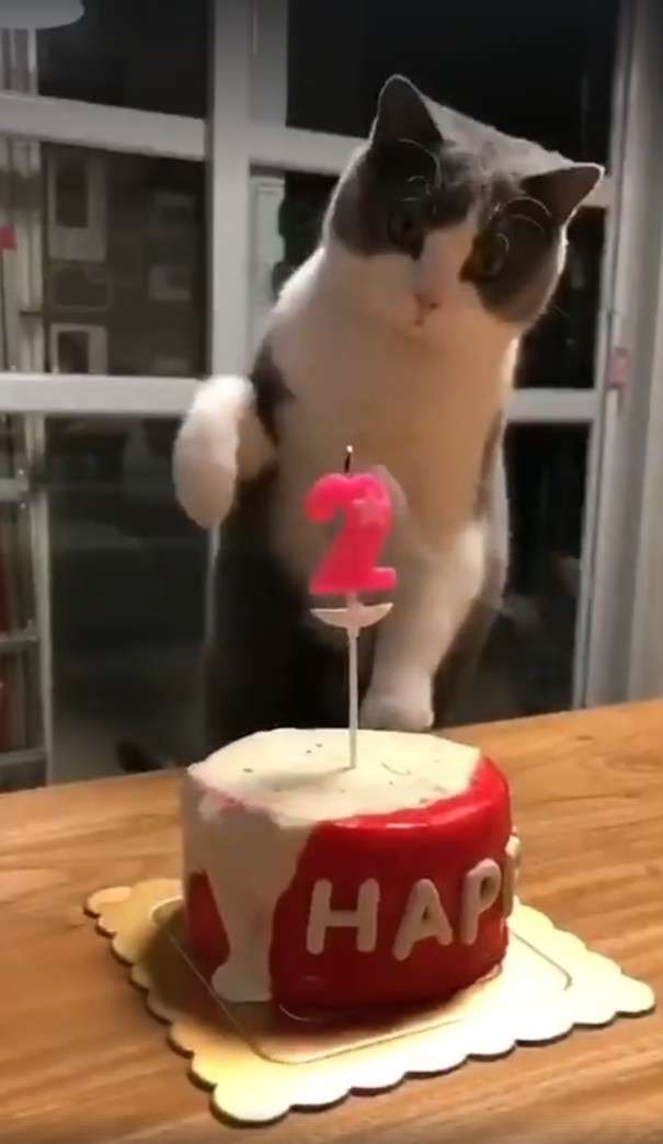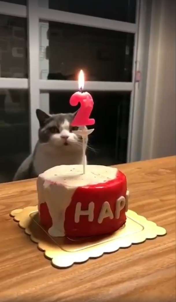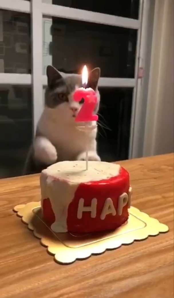 ▼影片一開始,主人為2歲生日的喵皇買了一個蛋糕,上面點了一根蠟燭。而喵皇也有模有樣的坐在蛋糕面前,看起來非常乖巧!