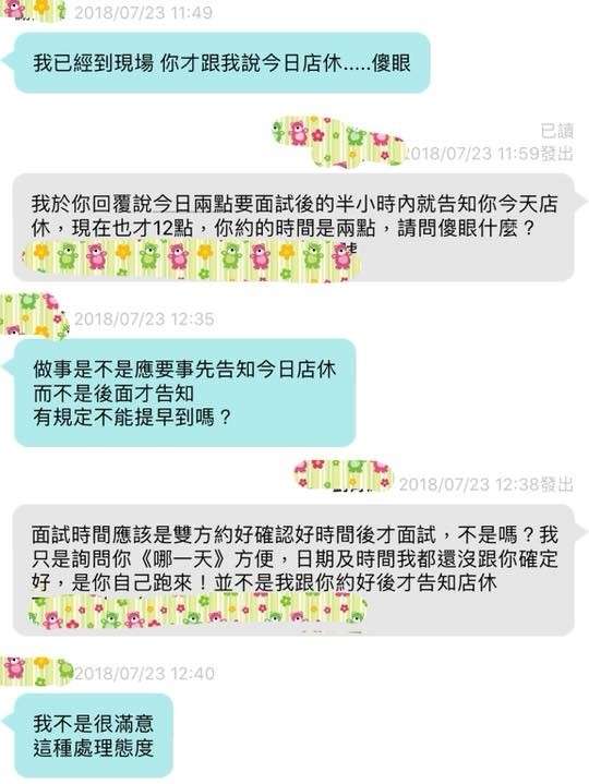 ▼原po耐心跟她解釋,面試應該是雙方約好、確認好時間才可以。她問女孩「哪一天方便」,並不是約好後才臨時告知店休。沒想到女孩根本不理睬,還回嗆:「我不是很滿意這種處理態度!」