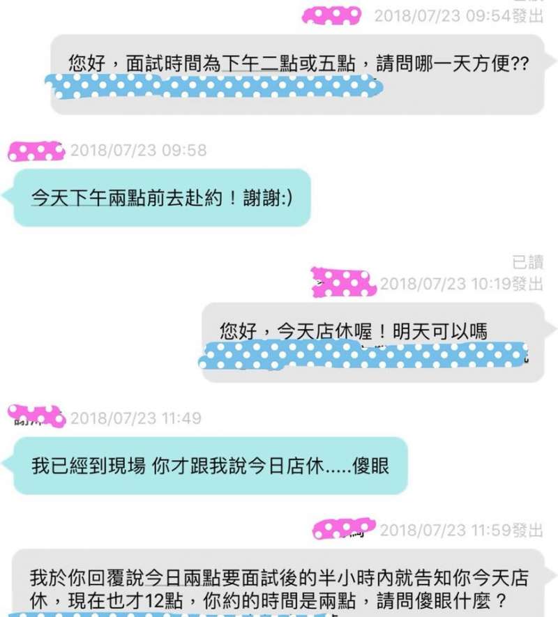 ▼高雄一間餐廳透過網路招募外場及內場人員,劉姓女網友負責面試應徵者。那天上午,一名24歲女孩與她聯絡,表示想來應徵。她為了給應徵者方便,就讓對方挑選面試時間。女孩希望下午2點過來面試,但那天正好店休。20分鐘後,原po看到訊息,禮貌告知情況,並問她明天可不可以,沒想到女孩竟然這樣說…