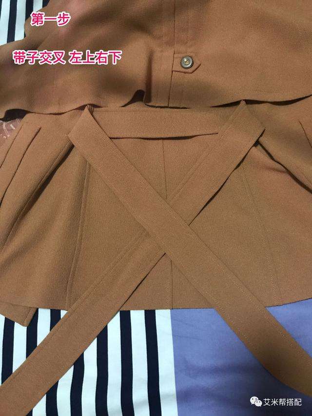 ▼首先調整帶子的長度,左邊稍長一些,然後交叉,左上右下;