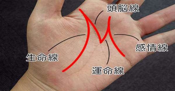 ▼「M字掌」顧名思義,就是掌紋中的生命線、智慧線、事業線和感情線互相交錯成為一個英文字母「M」的情況。