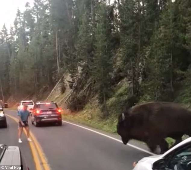 ▼當時遊客Lindsey Jones和家人到黃石國家公園遊玩,他們開車來到某一路段時,路邊出現了一隻907公斤左右的巨型野牛。車流慢下來,還有一些遊客乾脆將車停在路邊,等野牛離開。