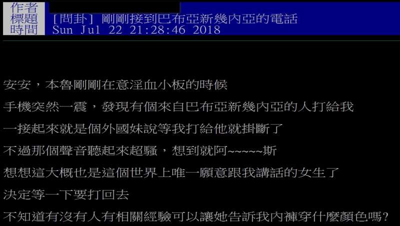 ▼2017年的6月底至7月間,無數日本民眾都接到了來自開頭為「+675」的電話,今年3月開始有澳門民眾接到;近日在《PTT》上有網友表示自己也接到了,接起來是個外國女子的聲音,只說了一句「等你打給我」就掛電話。網友形容她的聲音令人魂牽夢縈,忍不住想要回撥過去。
