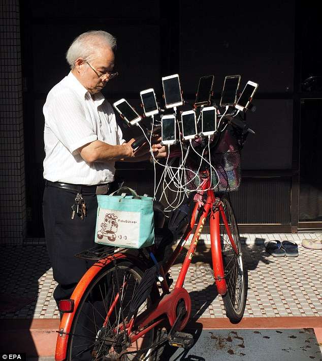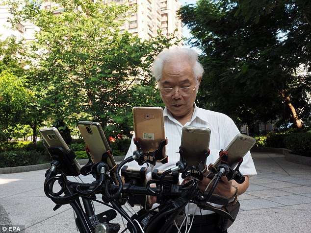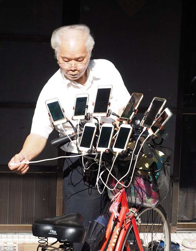 ▼阿伯的基本配備就是腳踏車跟11支手機。只有這樣,他才不需要等朋友到齊支援,一個人就可以搞定,不必浪費時間在等待上。他一次出門可以連續抓寶20小時!