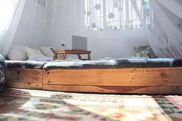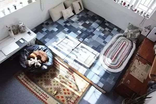 ▼臥室的榻榻米,是她用廢舊的板子、牛仔褲改造而成的。陽光充足的時候,她很喜歡待在這裡靜靜思考。她每天早上5點起床後,都會到這裡靜坐1個小時。