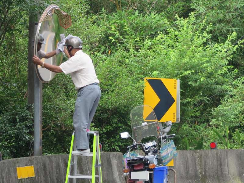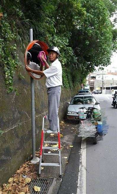 2018年08月15日行車反光鏡是重要的交通安全設施之一,但平時沒有人擦拭,很多反光鏡都髒髒的。8月12日,新北市土城區一名網友在凌晨4點多時,看到一名阿伯踩著梯子擦拭反光鏡,感恩表示:「辛苦了阿伯!」