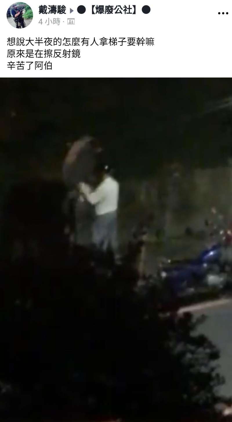 ▼那名網友將阿伯擦拭反光鏡的影片po到臉書社團「爆廢公社」,並說:「想說大半夜的怎麼有人拿梯子要幹嘛?原來是在擦反射鏡!辛苦了阿伯!」