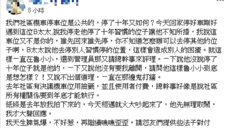2018年08月16日公共停車位就是給大家先到先得的,沒想到有人居然會認為停久了就屬於自己的了!臉書一名女網友的社區有住戶停公共停車位已經10年多,偶爾幾次她暫停就被「口頭告知」,最近還當面無理取鬧,讓她暴怒決定PO網!