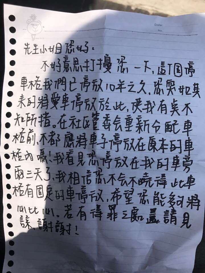 ▼超瞎的鄰居去年開始留下紙條:「這停車格我們已停放了10多年之久,您突如其來把愛車停放在此,讓我不知所措」。