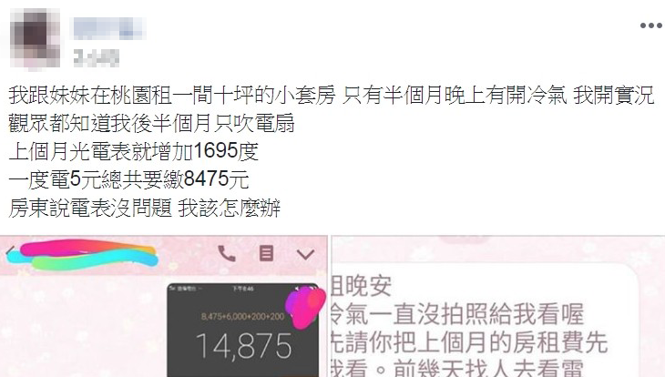 ▼房東某天突然告知用電量1695度,電費必須繳8475元!她瞬間傻眼崩潰,急得PO網向網友求救。