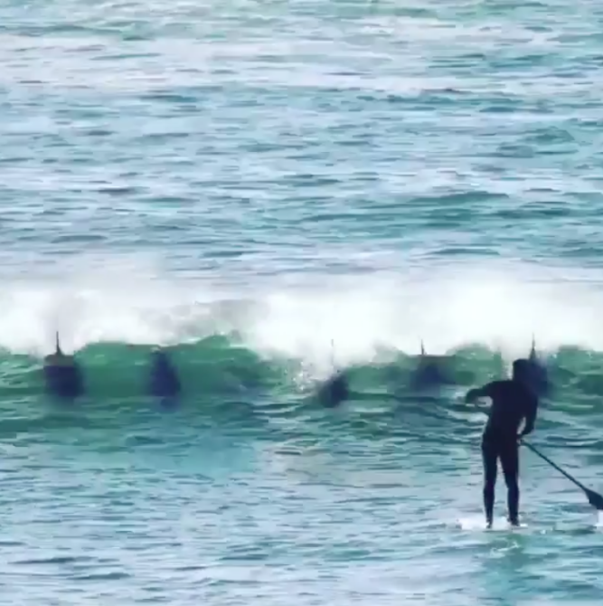 ▼準備立槳衝浪的男子以為牠們只會經過自己。