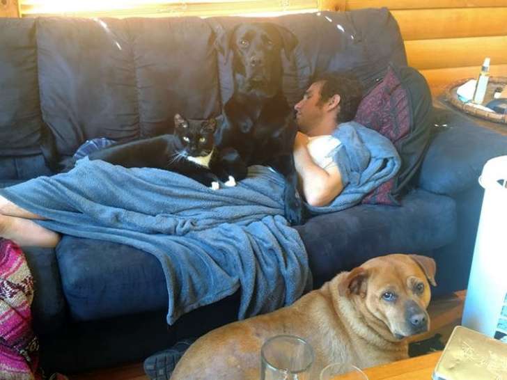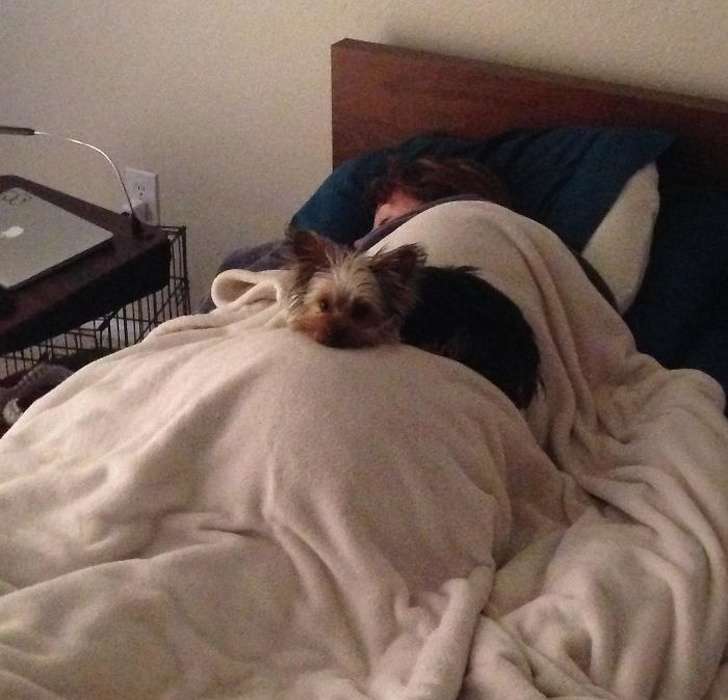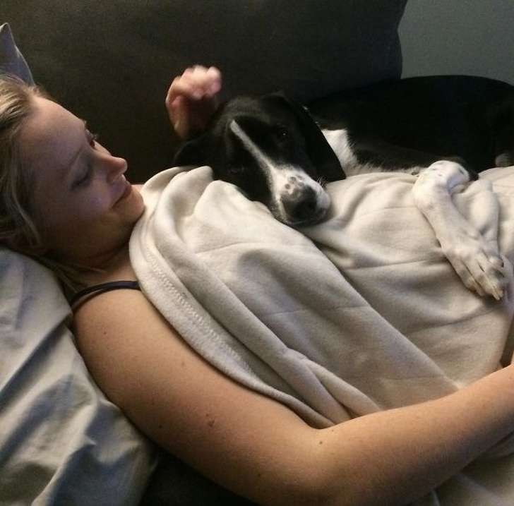 ▼狗狗掉進冰冷的池塘,主人跳下水將牠救上來。那天晚上狗狗睡覺時緊緊貼在主人身上。