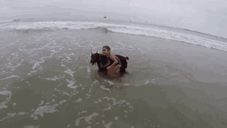 ▼大浪來襲,狗狗的第一反應是保護小主人。