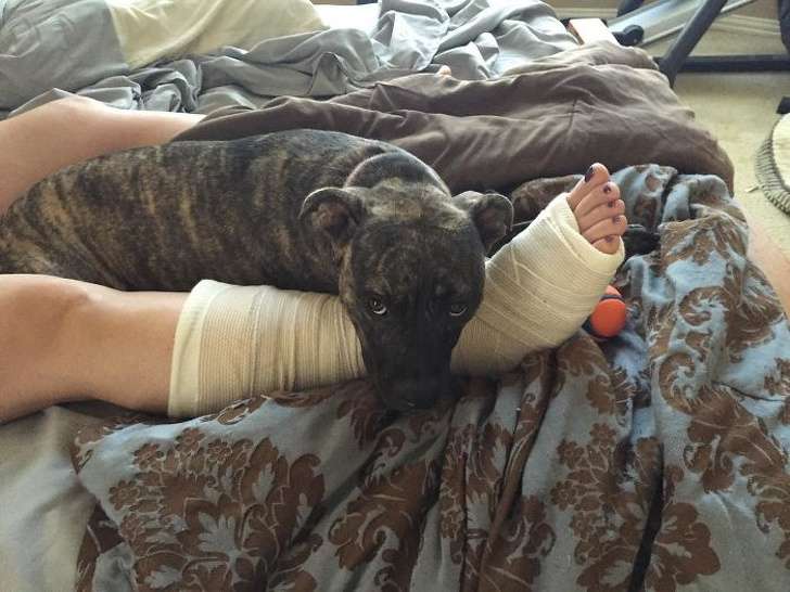 ▼她的腿受傷了,狗狗非常擔心,想要保護她。