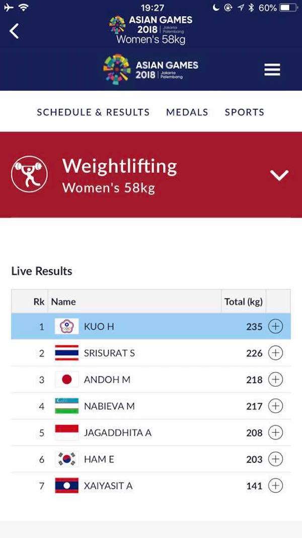 ▼挺舉部分,郭婞淳則是壓軸登場,第一次試舉重量先調降為125公斤,成功後其實已確定奪金。第二次她挑戰130公斤再度成功,第三次試舉本來想打破自己世大運142公斤的紀錄,嘗試143公斤,可惜最後失敗,但還是以總和235的成績摘金。